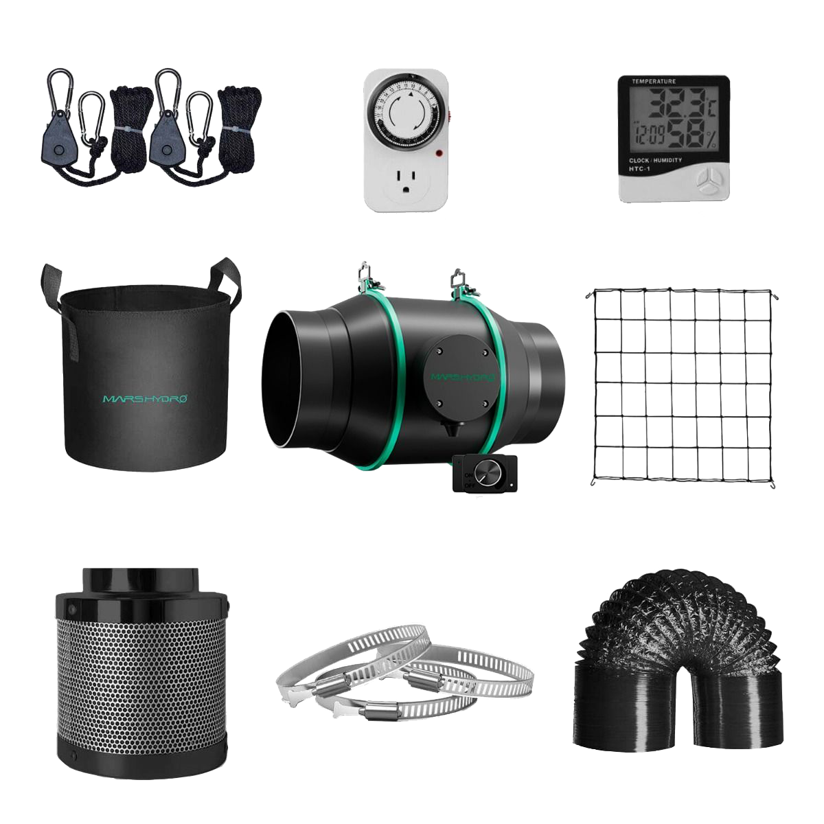 ชุดพัดลมท่อขนาด 6 นิ้วและฟิลเตอร์คาร์บอนของ Mars Hydro สามารถระบายและกรองอากาศในเต็นท์ปลูกขนาด 3x3, 4x4 หรือ 5x5 ฟุต เป็นตัวที่ดีที่สุดในการควบคุมสภาพแวดล้อมการปลูกของคุณด้วยอากาศสดชื่นและเย็น