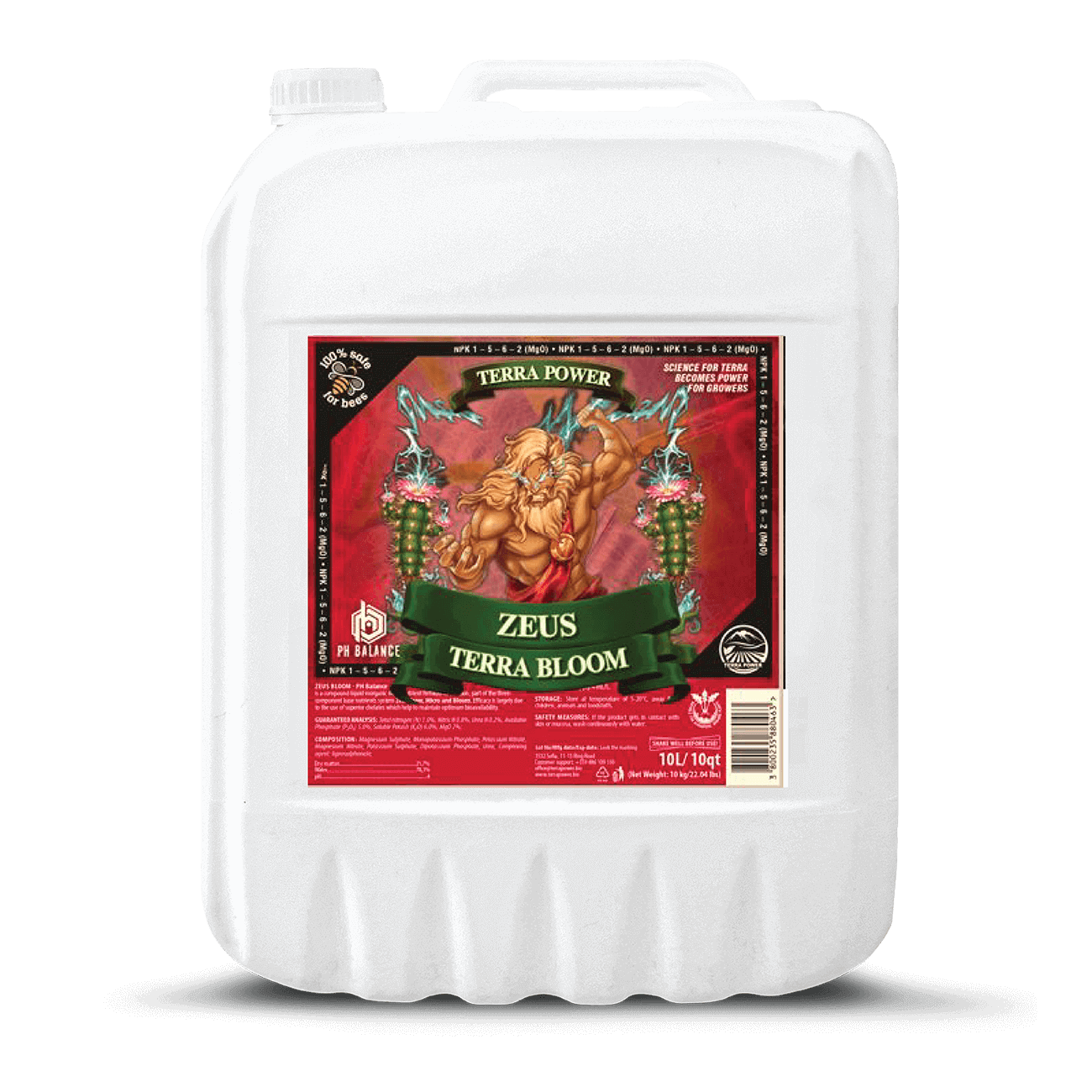 Terra Power ZEUS - TERRA BLOOM - เป็นหนึ่งในสามองค์ประกอบของกลุ่มปุ๋ยขั้นพื้นฐาน Terra Power ZEUS – TERRA GROW/ TERRA MICRO/ TERRA BLOOM – pH Balance ซึ่งต้องใช้ตั้งแต่สัปดาห์แรกในทุกระยะของการเจริญเติบโตของพืช ส่วนประกอบแต่ละส่วนของฐานคอมเพล็กซ์ ZEUS มีองค์ประกอบเสริม ประสิทธิภาพของผลิตภัณฑ์ส่วนใหญ่เนื่องมาจากการใช้คีเลตที่ดีเยี่ยม ซึ่งช่วยให้รักษาการดูดซึมที่เหมาะสมได้เป็นเวลานาน ซึ่งหมายความว่าพืชจะดูดซับสารอาหารจากสเปกตรัม pH ที่กว้างขึ้นอันเป็นผลมาจาก คีเลชั่นที่ดีเยี่ยม